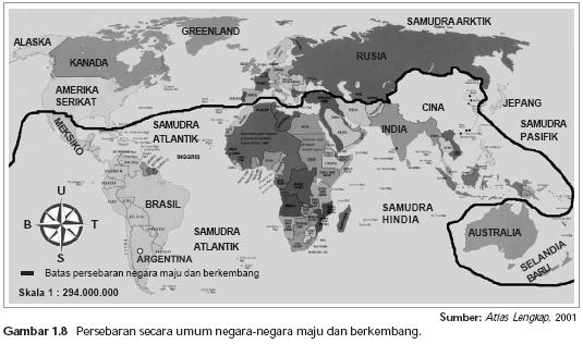 1. Ciri Negara maju dan berkembang:a. Negara Berkembang (Depeloping Country)Negara berkembang adalah Negara yang masih mendasarkan tiang perekonomiannya pada sektor pertanian.Ciri-ciri Negara BerkembangMenurut Daedjoeni dan Todaro, Negara berkembang memiliki ciri sebagai berikut :- Penduduknya kurang lebih 70 % bermatapencaharian di sector pertanian- Pengolahan pertanian masih menggunakan peralatan tradisonal- Tingkat kehidupan yang rendah- Pendidikan formal dan pendidikan informal masih kurang memadai- Pertumbuhan penduduk yang tinggi- Belum ada kesetaraan gender- Angka beban pertanggunagan tinggi- Tingginya tingkat pengangguran- Ketergantungan kepada Negara maju sangat tinggib. Negara maju (Develoved Country)Negara maju adalah Negara yang mengutamakan unsur-unsur industri sebagai tiang perekonomiannya.Ciri-ciri Negara Maju– Sebagian besar penduduknya bekerja pada sector industri dan jasa- Sektor pertanian hanya merupakan sector minoritas- Kualitas sumber daya manusianya tinggi- Pendapatan per kapitanya tinggi (di atas US$ 10.000- Pertumbuhan penduduknya rendah- Angka kelahiran dan kematian relatif rendah- Tingkat pendidikannya tinggi- Tidak ditemukan adanya kemiskinan- Konsentrasi penduduknya berada di daerah perkotaan2. Peta Negara Maju dan Berkembang